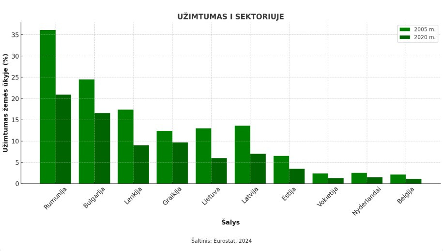 3. Įvardyk 2-4 šalis, kuriose 2020 m. buvo didžiausias užimtumas I sektoriuje.